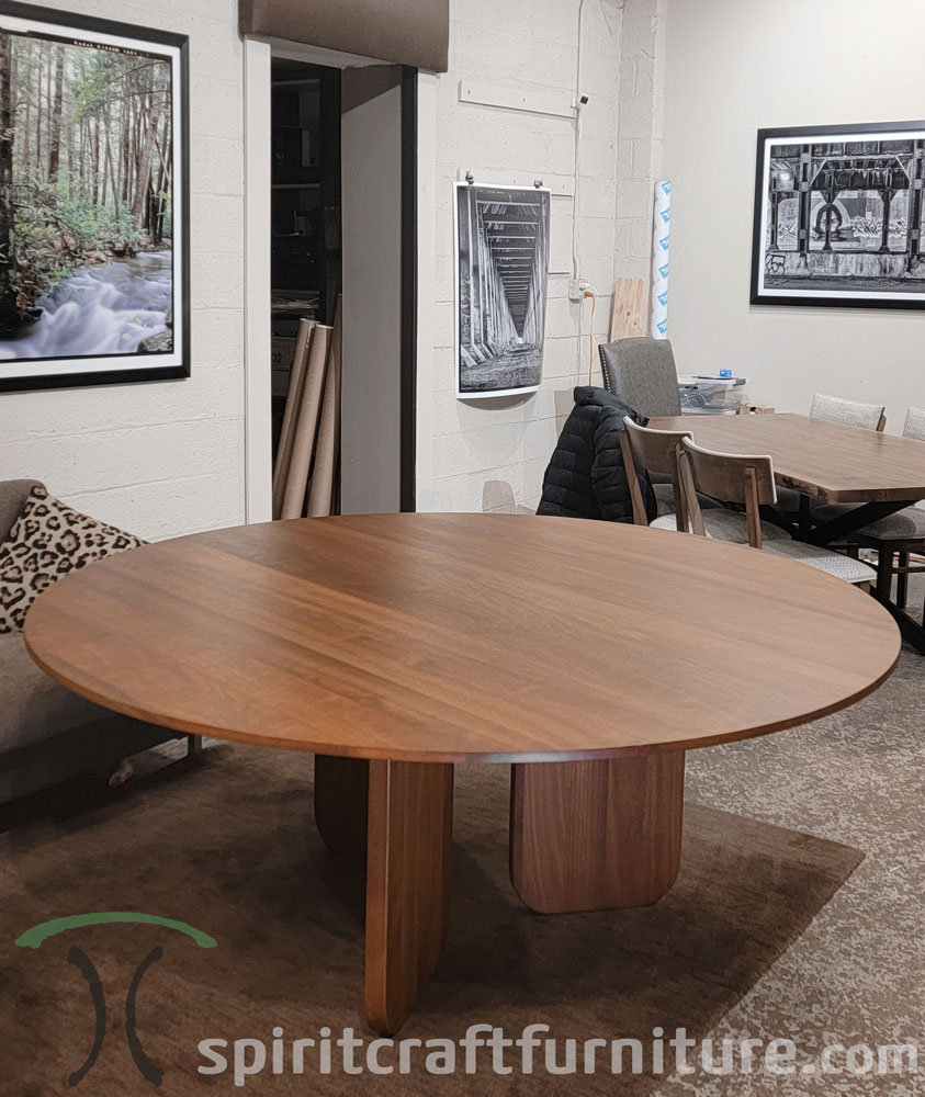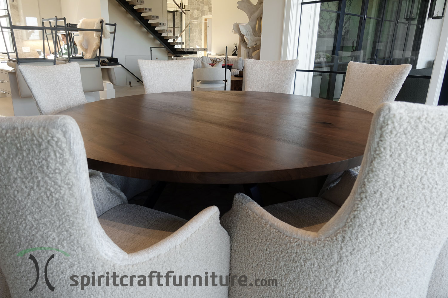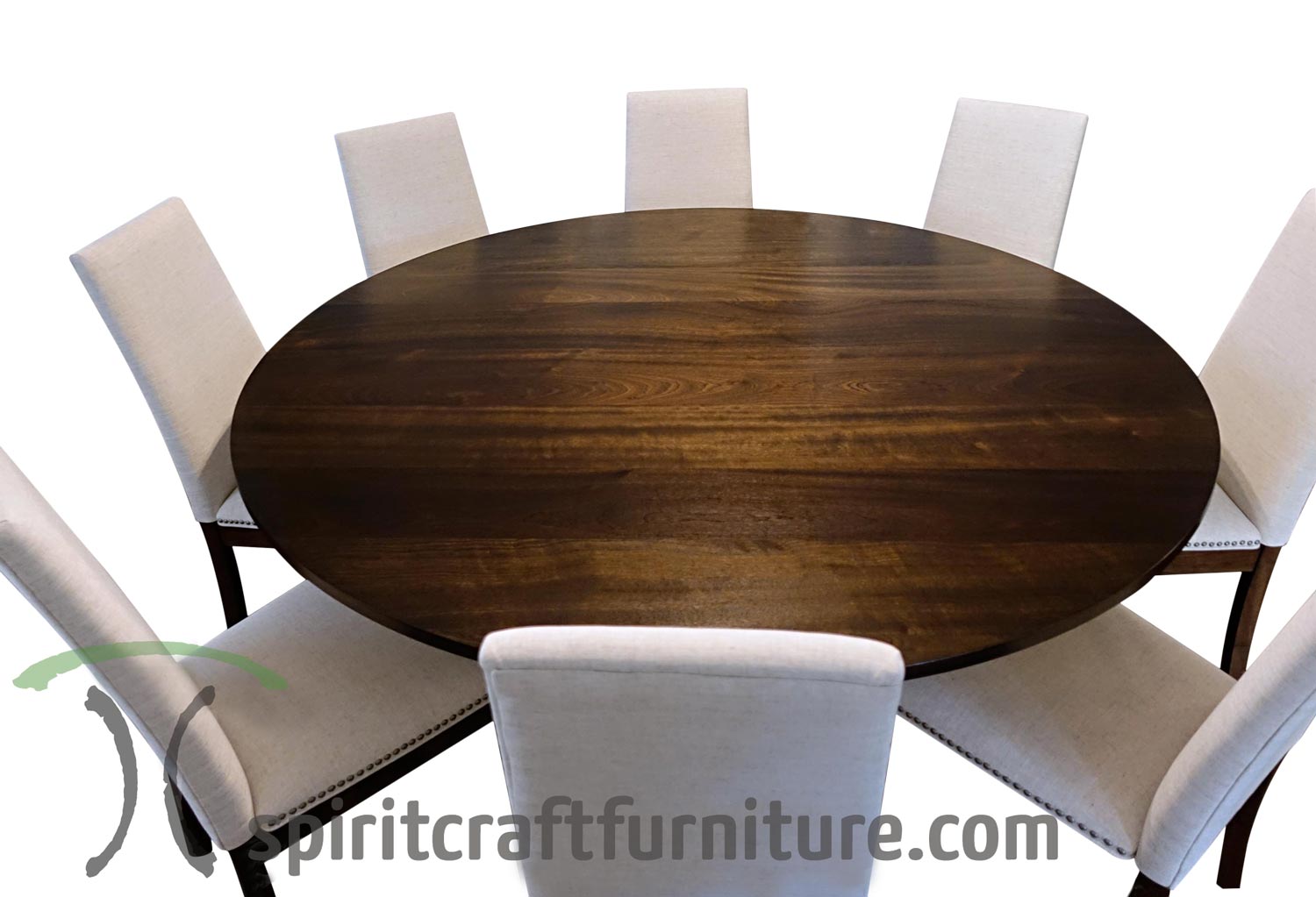 Our custom made round dining tables are unmatched in terms of quality and price. Each custom made table is crafted from select kiln dried hardwood boards and made to endure generations. Our tops are crafted from hand selected boards to assure quality and eye appeal. We offer many different leg and base options and sell our tops without legs if desired. Our tops are crafted to your specifications in Walnut, Hard Maple, Ash, Sapele & African Mahogany, White Oak, Hickory and other non-endangered hardwoods.